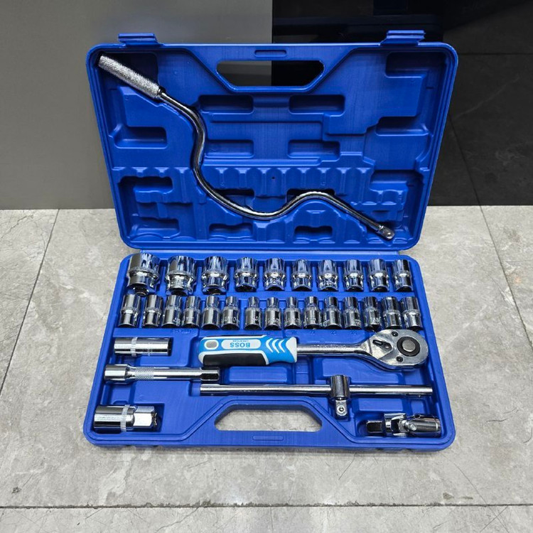 مشخصات: ✔ درایو ۱/۲ (سایز بزرگ) ✔ دارای ۱۸ عدد بکس( سایزهای: ۸، ۱۰، ۱۱، ۱۲، ۱۳، ۱۴، ۱۵، ۱۶، ۱۷، ۱۸، ۱۹، ۲۰، ۲۱، ۲۲، ۲۴، ۲۷، ۳۰ و ۳۲) ✔ دارای جغجغه ضامن دار کله گاوی و قدرتمند ✔ به همراه کمک بکس ۱۲.۵