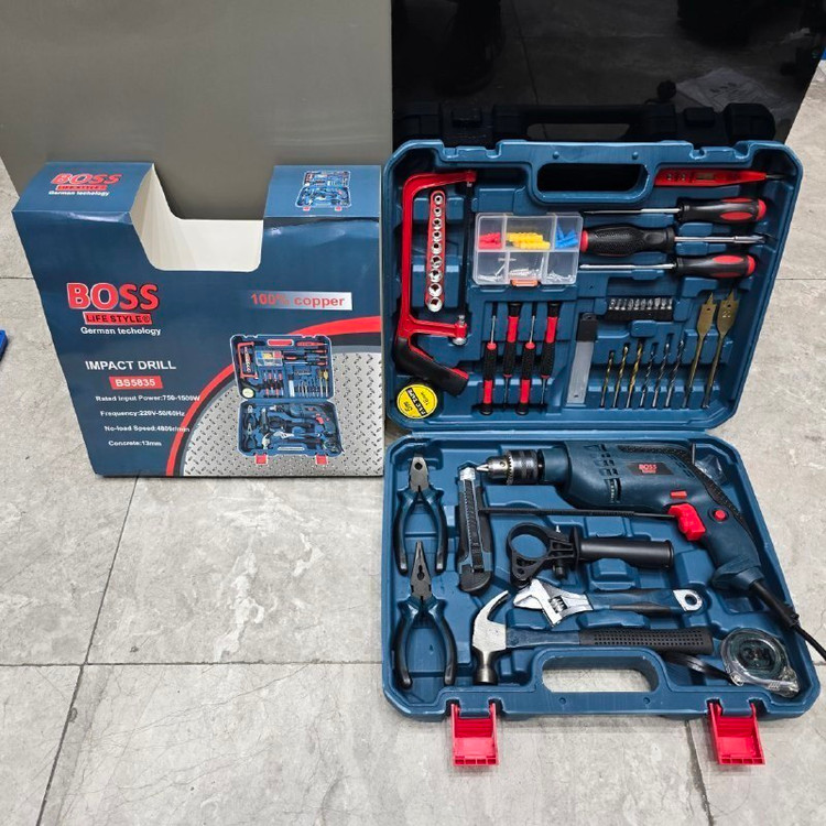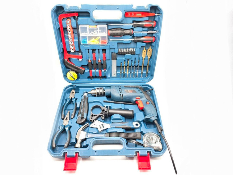 مشخصات: ✔ دریل ۱۰۰۰ وات چکشی، دارای دیمر و چپگرد و راستگرد ✔ سیم پیچ آلومینیوم ✔ دارای کلیه ابزارهای مصرفی شامل؛ آچار فرانسه سایز۸، انبردست، دمباریک، چکش، بکس تک سایز ۴ تا ۱۳، متر ۳ متری، پیچ گوشتی دوسو و چهارسو سایز بزرگ، پیچ گوشتی نوک خور،