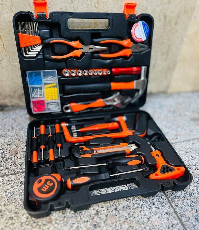 کیت کامل ابزار دستی ۱۰۰ عددی کربن شامل پیچ گوشتی دو سو و چهارسو، چکش، آچار فرانسه سایز ۸ ، متر، کاتر و ...