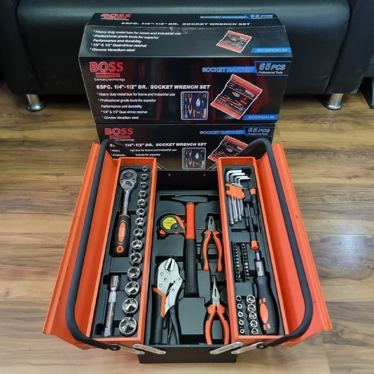 دارای: انبردست و دمباریک،۲۲ عدد بکس نوک پیچ گوشتی،یک سری آلن ته گرد ۱.۵ تا ۱۲ میلیمتر،یک عدد متر ۳ متری، انبر قفلی، چکش و ....به همراه کیف حمل فلزی اتوماتیک کیفیت بالا