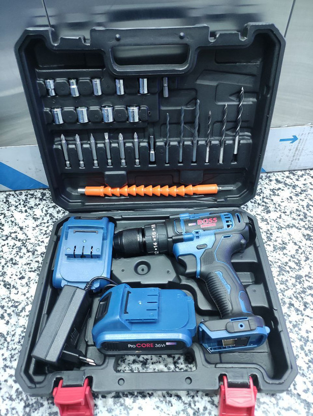 ۳۶ ولت ، ۲ باطری لیتیوم یونی، چکشی دار، سه نظام فلزی، باطری کتابی، ۳ حالته ( سوراخ کاری فلزات، چوب و PVC ،پیچ بند و سوراخ کاری چکشی)، ترکمتر دار ( تنظیم قدرت)، ماشه گازی، چپگرد راستگرد،به همراه لوازم کامل مطابق عکس