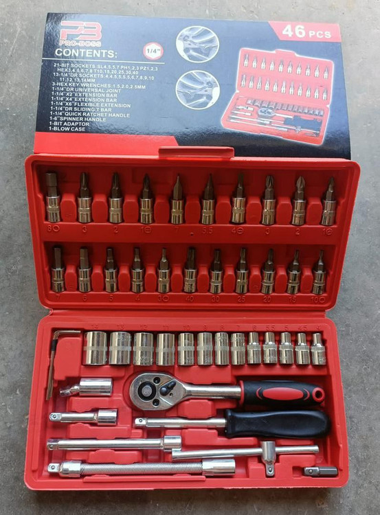 مشخصات: ✔ درایو ۱/۴ ✔ دارای ۱۳ عدد بکس( سایزهای: ۴، ۴.۵، ۵، ۵.۵، ۶، ۷، ۸، ۹، ۱۰، ۱۱، ۱۲، ۱۳ و ۱۴) ✔ ۲۱ عدد انواع بکس پیچ گوشتی ✔ دارای جغجغه ضامن دار ✔ به همراه دو عدد کمک بکس ۵ و ۱۰ سانتی متری ✔ دارای دسته بکس کشویی ✔ به همراه رابط بکس تاشو ۱/۴ و ....