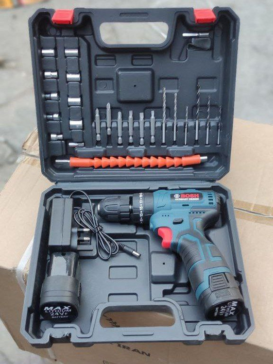 موتور براشلس بدون زغال، ۲۴ ولت (۴ سلول)، دو باطری لیتیوم یونی، چپگرد راستگرد کیفیت عالی به همراه لوازم و کیف حمل