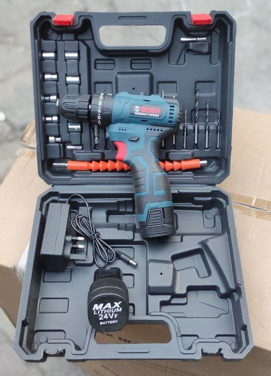 مشخصات: موتور براشلس بدون زغال، ۲۴ ولت (۴ سلول)، دو باطری لیتیوم یونی، چپگرد راستگرد کیفیت عالی به همراه لوازم و کیف حمل