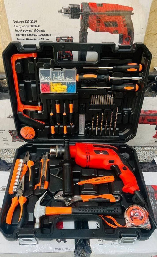دریل برقی ۱۳ چکشی دار، دیمر دار، ۱۲۰۰ وات ،چپگرد راستگرد، ماشه گازی ، دسته کمکی به همراه ابزاردستی کامل مطابق عکس