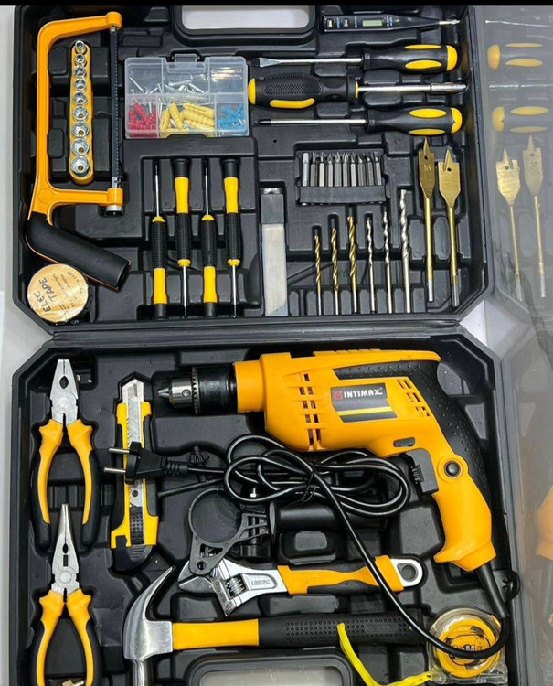 دریل برقی ۱۲۰۰ وات ، دیمر دار، چکشی دار، چپگرد راستگرد، به همراه کلیه ی ابزارهای دستی مطابق عکس شامل چکش، آچار فرانسه، پیچ گوشتی، کمان اره چوب و فلز، متر، کاتر و ...