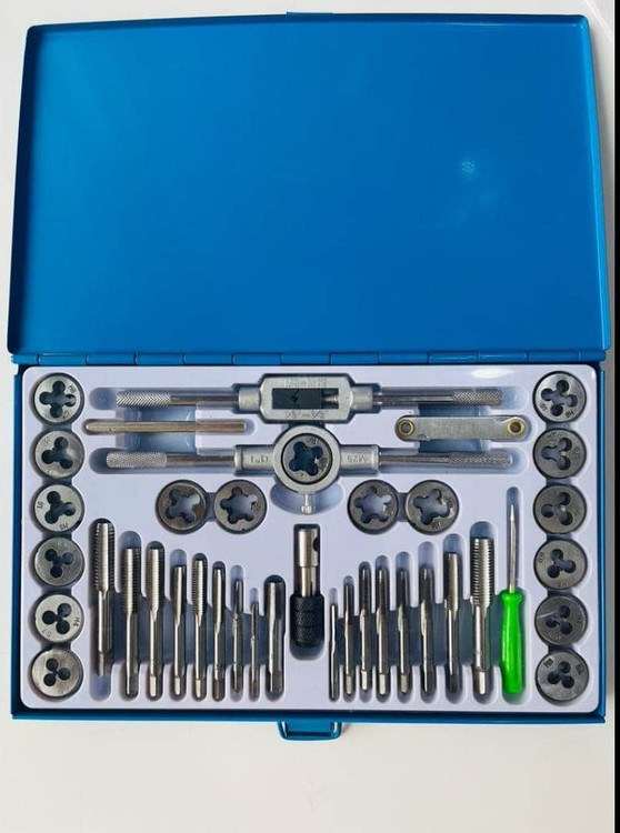 شامل ۱۶ عدد حدیده و قلاویز از سایز ۳ تا ۱۲ میلیمتر دنده استاندارد، شامل ۱۶عدد حدیده و قلاویز از سایز ۳ تا ۱۲ میلیمتر دنده ریز ، دسته حدیده، دسته قلاویز، دسته قلاویز گردان ، پیچ گوشتی و ... جعبه فلزی کیفیت بالا