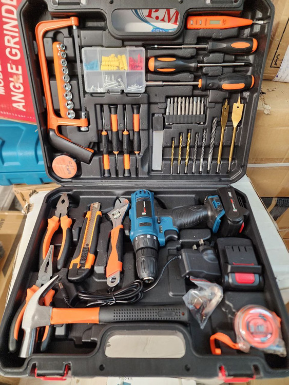 دو باطری، ۲۸ ولت (۱۸ ولت واقعی) ، چپگرد راستگرد، نشان گر شارژ، به همراه ابزاردستی کامل مطابق عکس آچار فرانسه، متر، کاتر، انبردست و ...